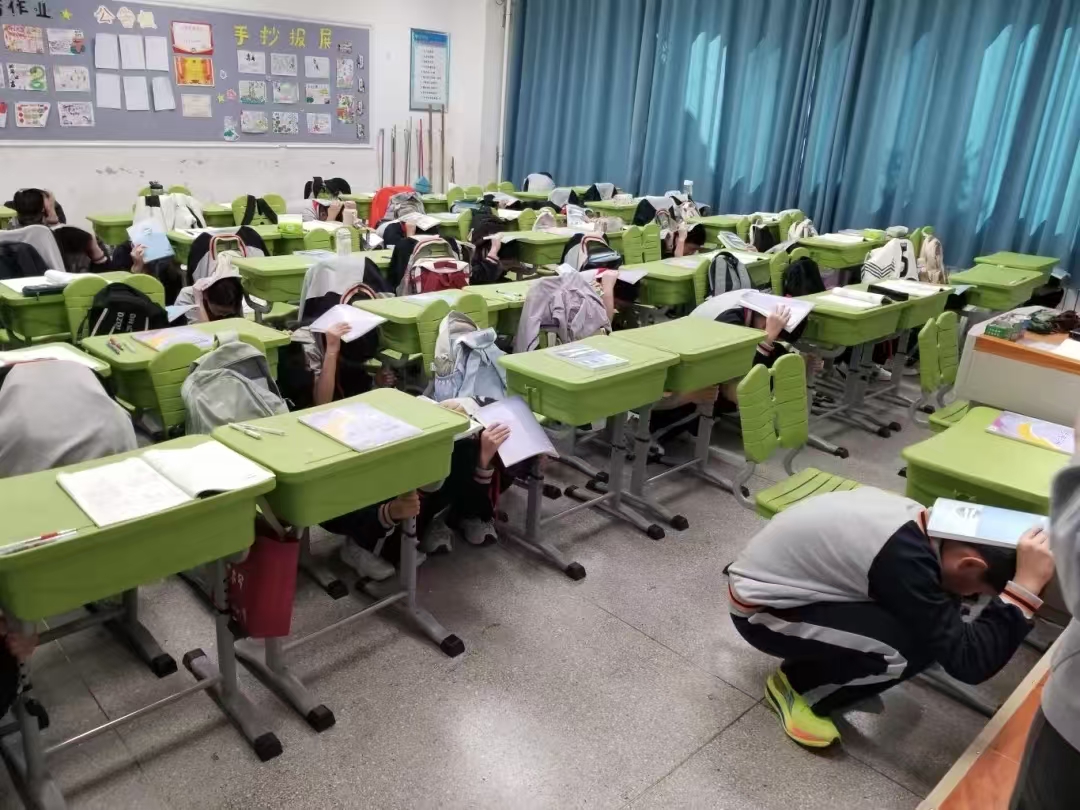 本次演练严格参照《山东省校园安全风险防控指南》标准筹备。前期,济宁市防震减灾中心,太白湖新区管委会、应急管理局、教育分局的相关领导给予了重点关注和具体指导。学校结合校园建筑布局优化疏散路线,修订完善《校园避震应急预案》,并通过班会课讲解“伏地、遮挡、手抓牢” 避震口诀,确保师生掌握基础自救技能。
